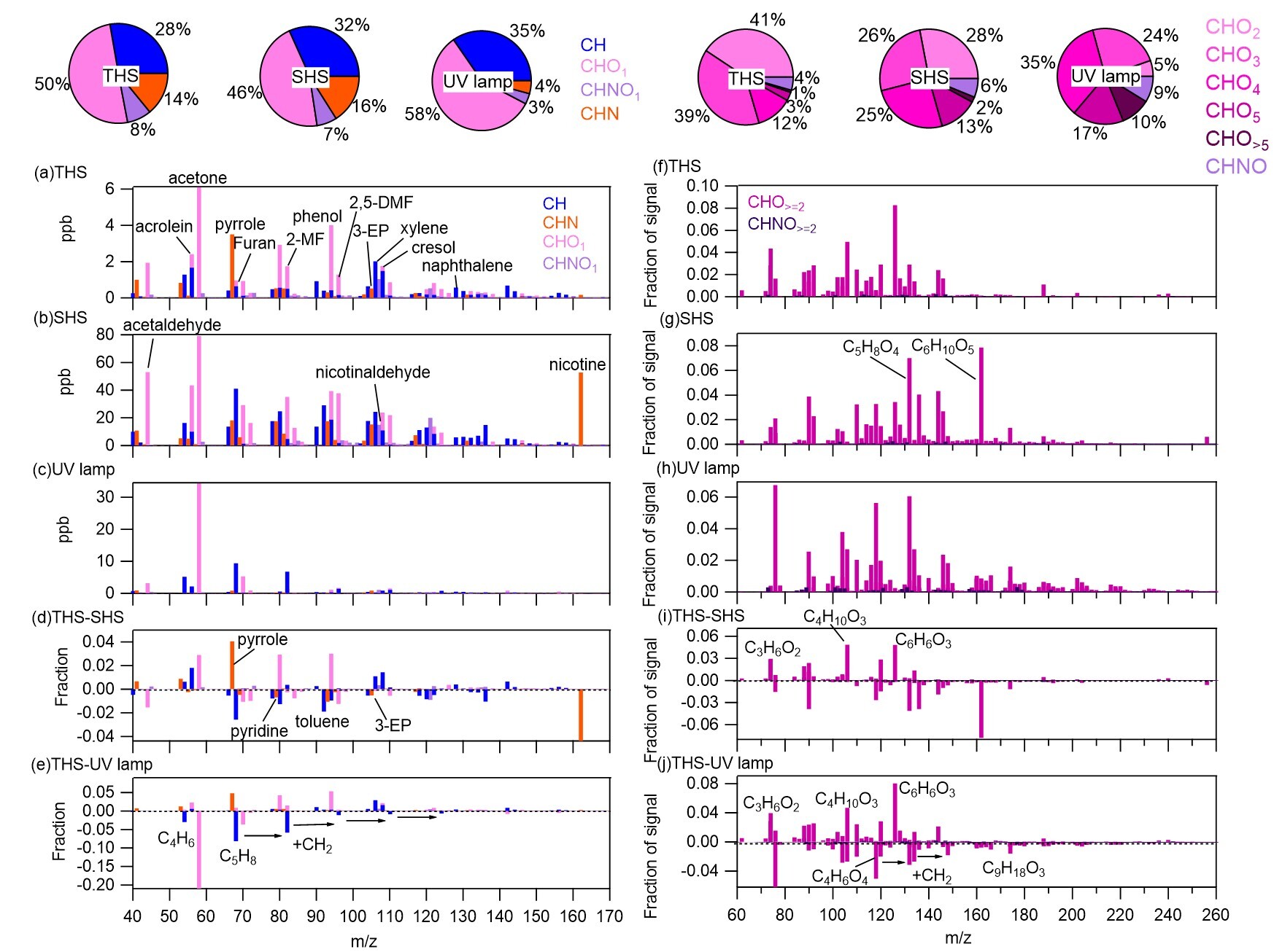 图2. 二手烟与三手烟的气态有机化合物谱图和组分占比