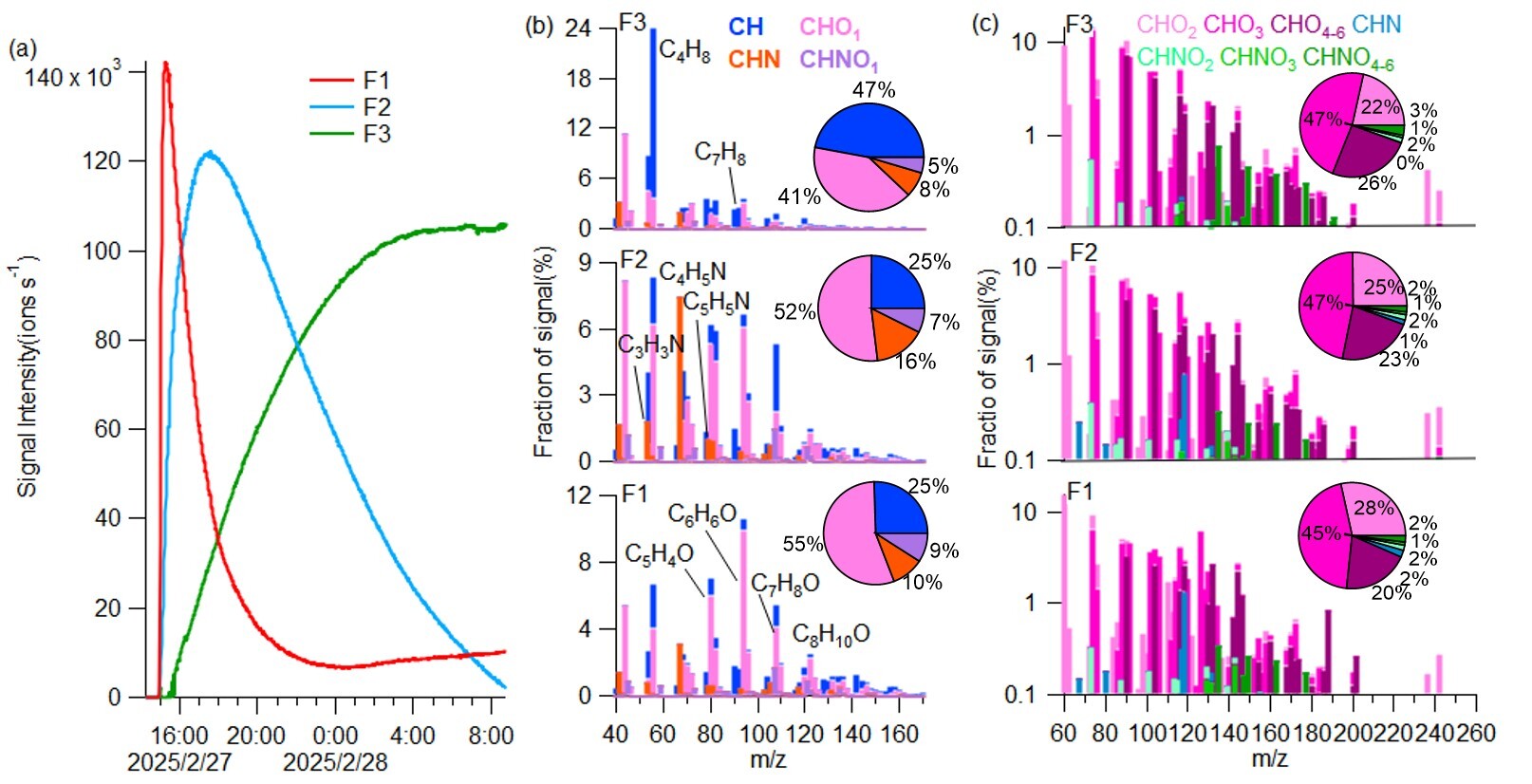 研究还揭示了三手烟三阶段动态释放规律,包括(1)快速释放期:初期主要以高挥发性的CHO类化合物释放为主,导致室内污染物浓度出现短期峰值,构成即时的吸入暴露风险;(2)持续释放期:随后数小时,释放主体转变为含氮挥发性有机物(如烟碱衍生物),这些中等挥发性有机物(IVOCs)从材料深处缓慢释放,标志着烟草特有毒性物质的稳定输出;(3)长效拖尾期:最终进入以烃类(CH)化合物和氧化产物为主的缓慢、长效释放阶段(图3)。综上,该研究为准确识别和评估三手烟污染提供了关键的化学标志物,也为制定针对性的室内空气质量标准提供了科学依据。大气所博士研究生杨柳为论文第一作者,周维副研究员为共同第一作者,孙业乐研究员为通讯作者。