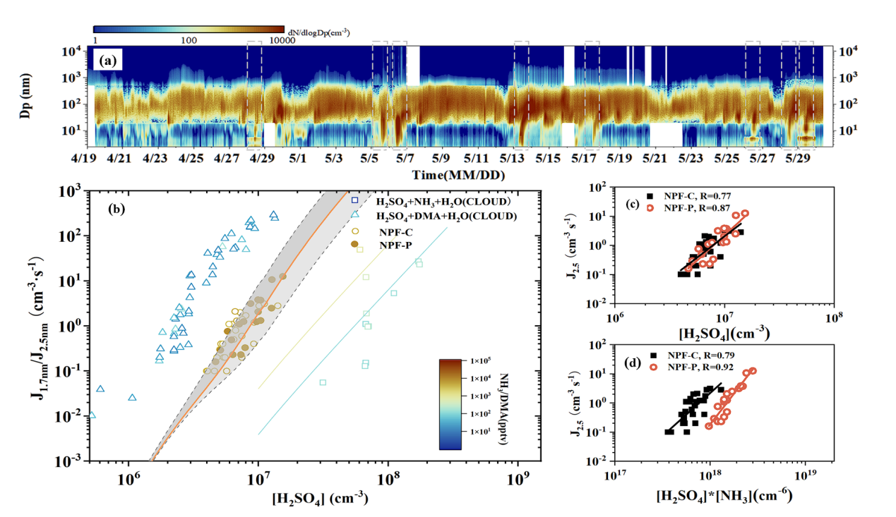 图1.上黄站整个观测期内的数谱分布和新粒子成核机制分析。(a) 颗粒物数浓度谱分布(dN/dlogDp),虚线框标记为NPF天。(b) 外场观测和CLOUD烟雾箱模拟实验中,气态硫酸(H2SO4)浓度与成核速率(J)的线性拟合关系。其中CLOUD实验为278K、38%相对湿度以及给定前体物浓度条件下的模拟结果:H2SO4–NH3–H2O(正方形,NH3 = 0.1和1 ppbv)以及H2SO4–DMA–H2O(三角形,DMA(二甲胺)= 13-140 pptv);黄色线条及其阴影代表模型针对本研究外场观测条件下的模拟结果(5 pptv NH3);(c) NPF-C(黑色方块)和NPF-P(红色空心圆点)事件中J与H2SO4浓度的线性拟合关系。(d) NPF-C(黑色方块)和NPF-P(红色空心圆点)事件中J与H2SO4和NH3浓度乘积的线性拟合关系。
