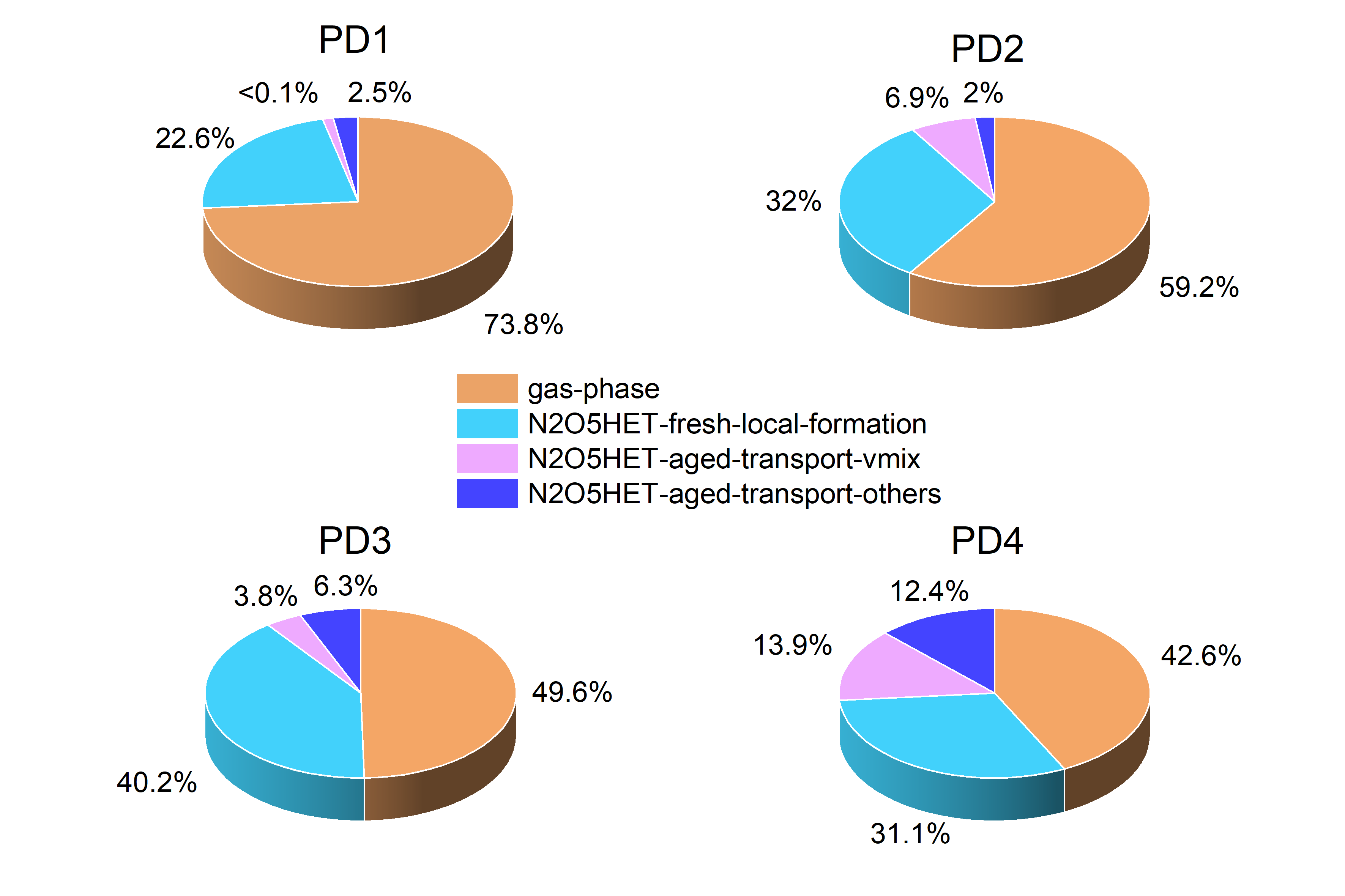 图1、秋季北京地区地表pNO3-在四个污染过程中的生成传输途径贡献占比图:Gas-Phase:NO₂与 OH 自由基气相反应途径;N2O5HET-fresh-local-formation:由区域大气输送补充 O3、N2O5等反应物所维持的局地N2O5水解反应途径;N2O5HET-aged-transport-vimx/others:由垂直混合/其他输送途径驱动的水解生成pNO3-老化输送。