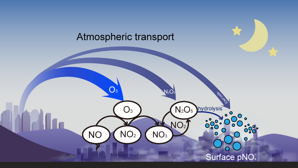 图2、区域输送驱动下城市夜间N2O5水解主导地表硝酸盐生成机制示意图